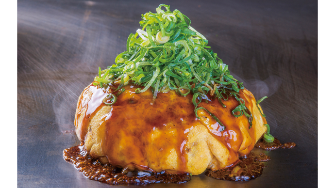 盛り上がる球体 お好み焼きで高さ約10cmが名物